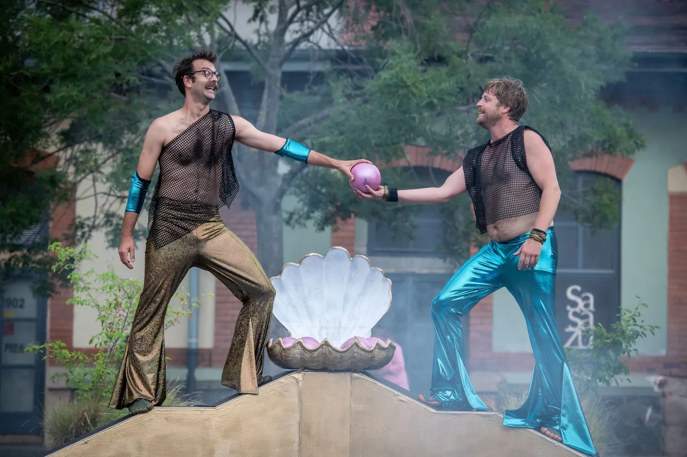 Pouliční rodinné představení. Z hlubin oceánu na lidskou pevninu. Dva mořští pánové, ozbrojeni trojzubci a zvídavostí, přicházejí na souš, aby zjistili, co otřáslo jejich světem.